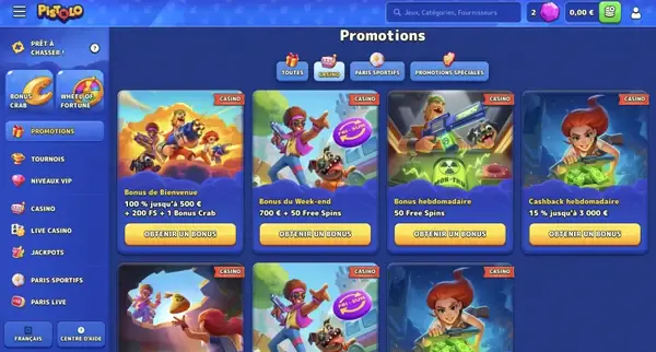 Nos promotions s’articulent autour des bonus de dépôt, des tours gratuits, du cashback, des boosts de paris sportifs et des compétitions à durée limitée. Vous trouverez généralement les offres dans la zone promo, et certaines promotions peuvent nécessiter une inscription (opt-in) ou la saisie d’un code à la caisse. Si vous cherchez un bonus sans dépôt Pistolo casino, veuillez noter que nous n’en affichons pas comme offre standard ; lorsque les conditions changent, la page Promotions reste la meilleure source. Pour un point de départ clair, les options de bonus Pistolo sont affichées avec les exigences de mise et les règles d’éligibilité avant que vous ne réclamiez l’offre.