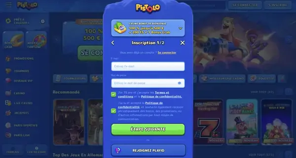 - Ouvrez le formulaire d’inscription et saisissez votre e-mail ainsi qu’un mot de passe robuste pour votre compte Pistolo Casino.